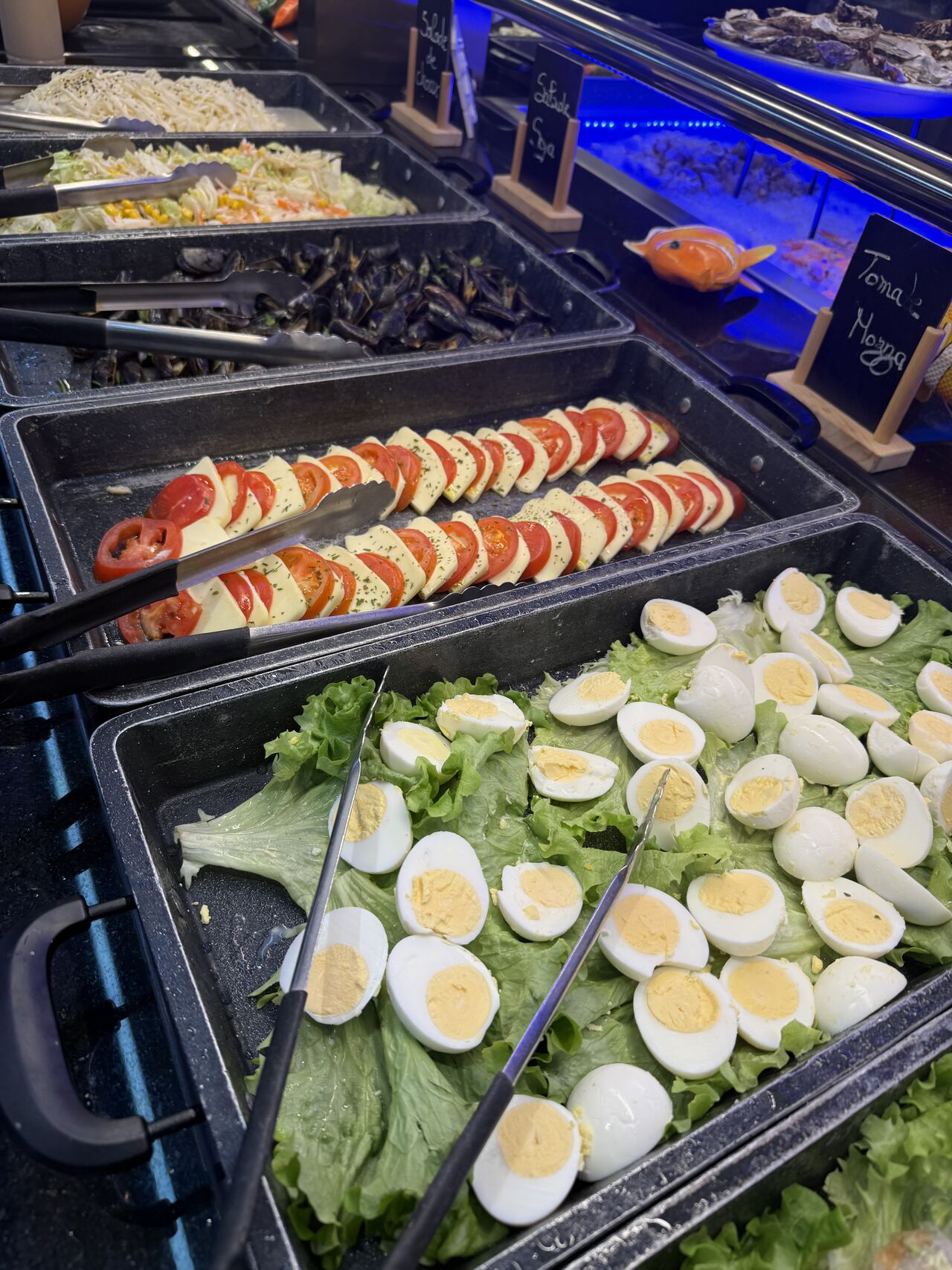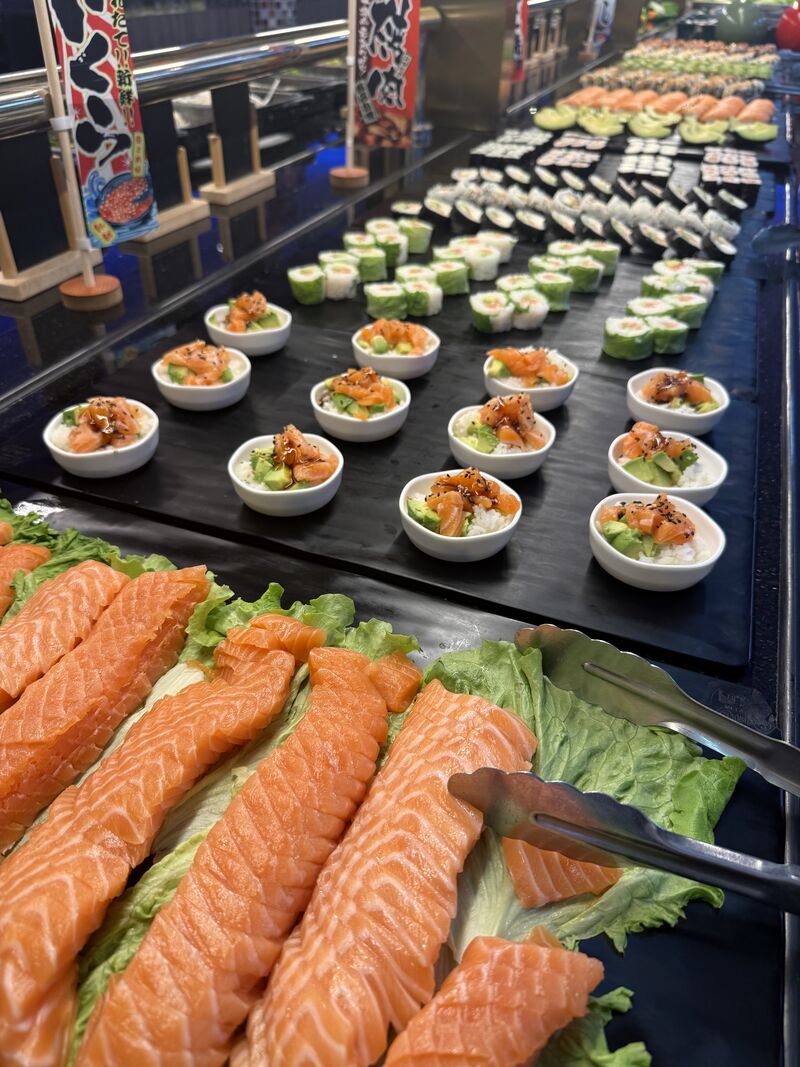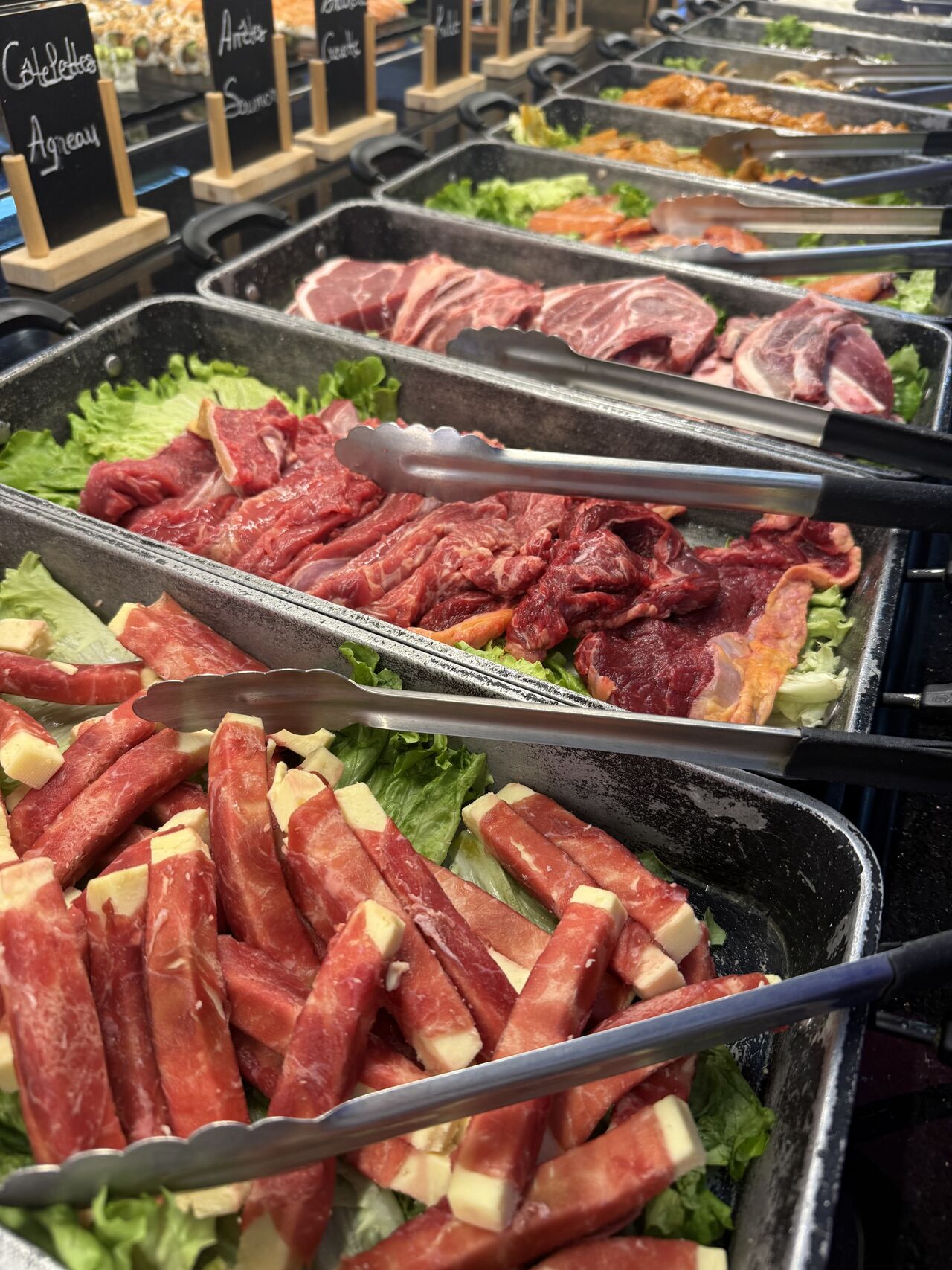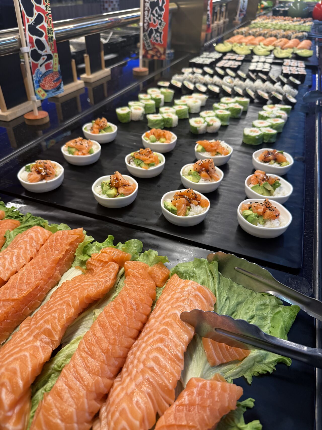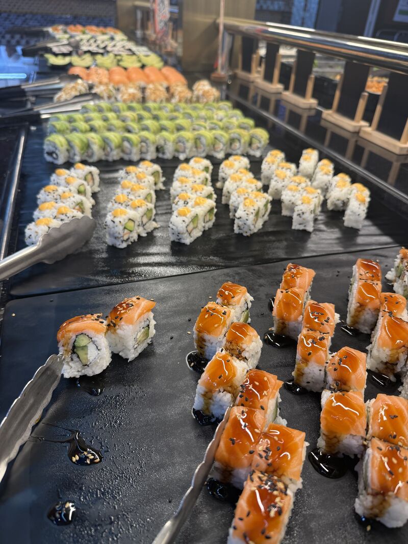 Les amateurs de fraîcheur apprécieront également notre choix de sushis et de salades 🥗🍣, tandis que les plus gourmands pourront se laisser tenter par un buffet de desserts variés 🍰🍦🍡 pour terminer le repas sur une note sucrée.